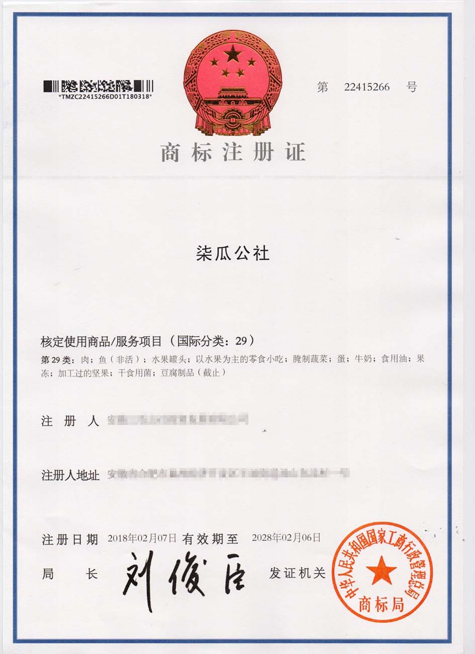 第29类“柒瓜公社”商标注册证