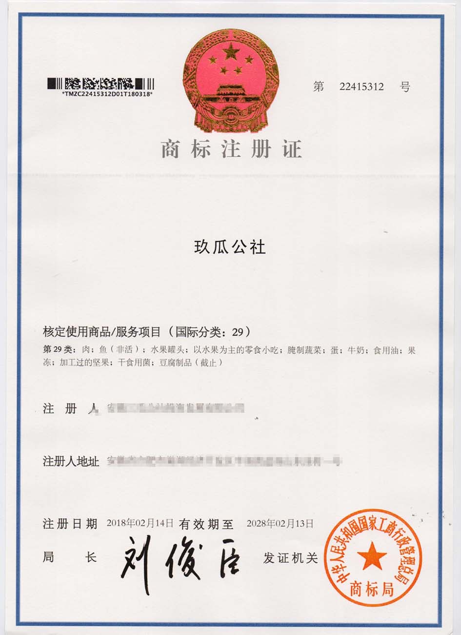第29类“玖瓜公社”商标注册证