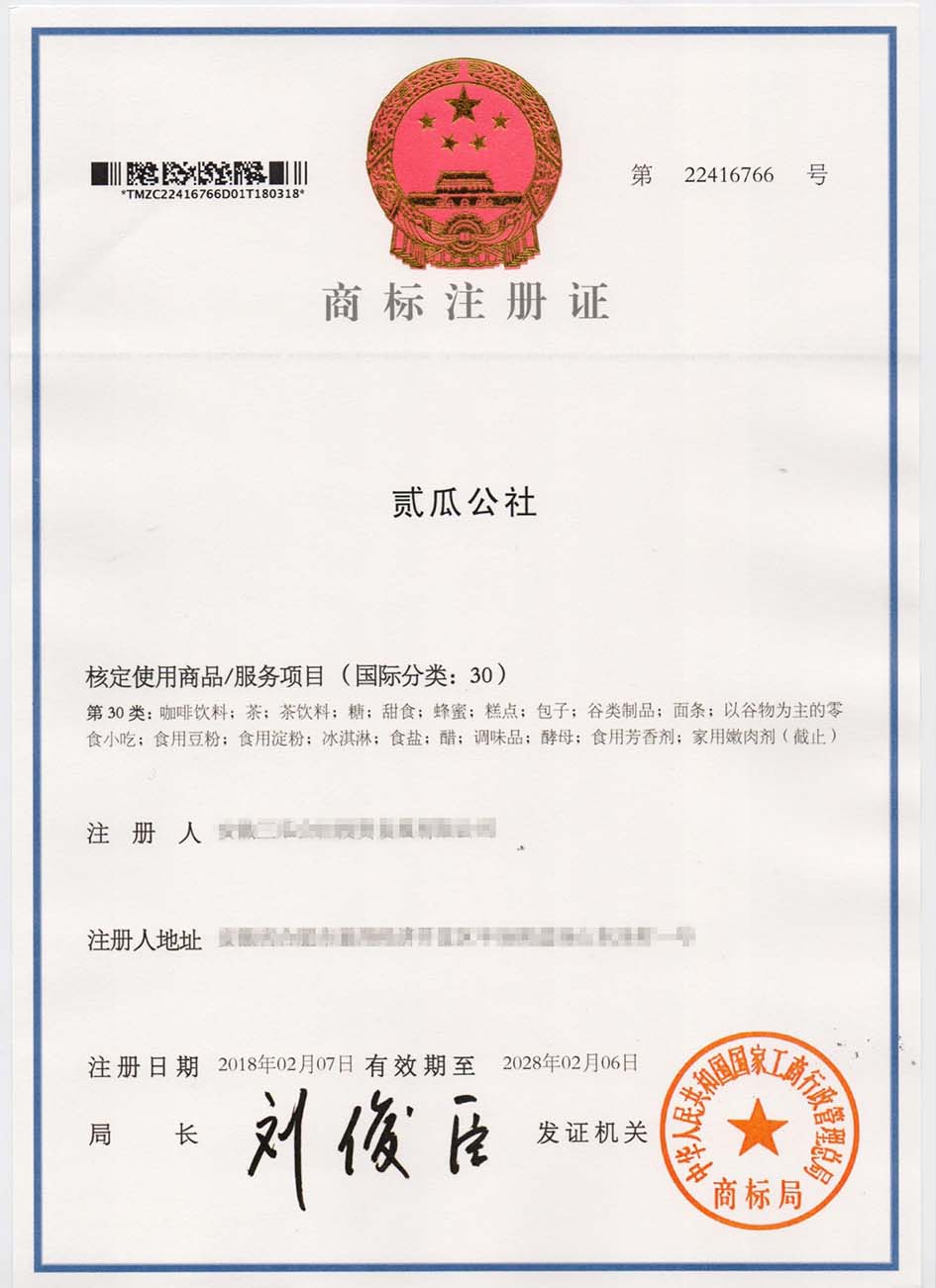 第30类“贰瓜公社”商标注册证