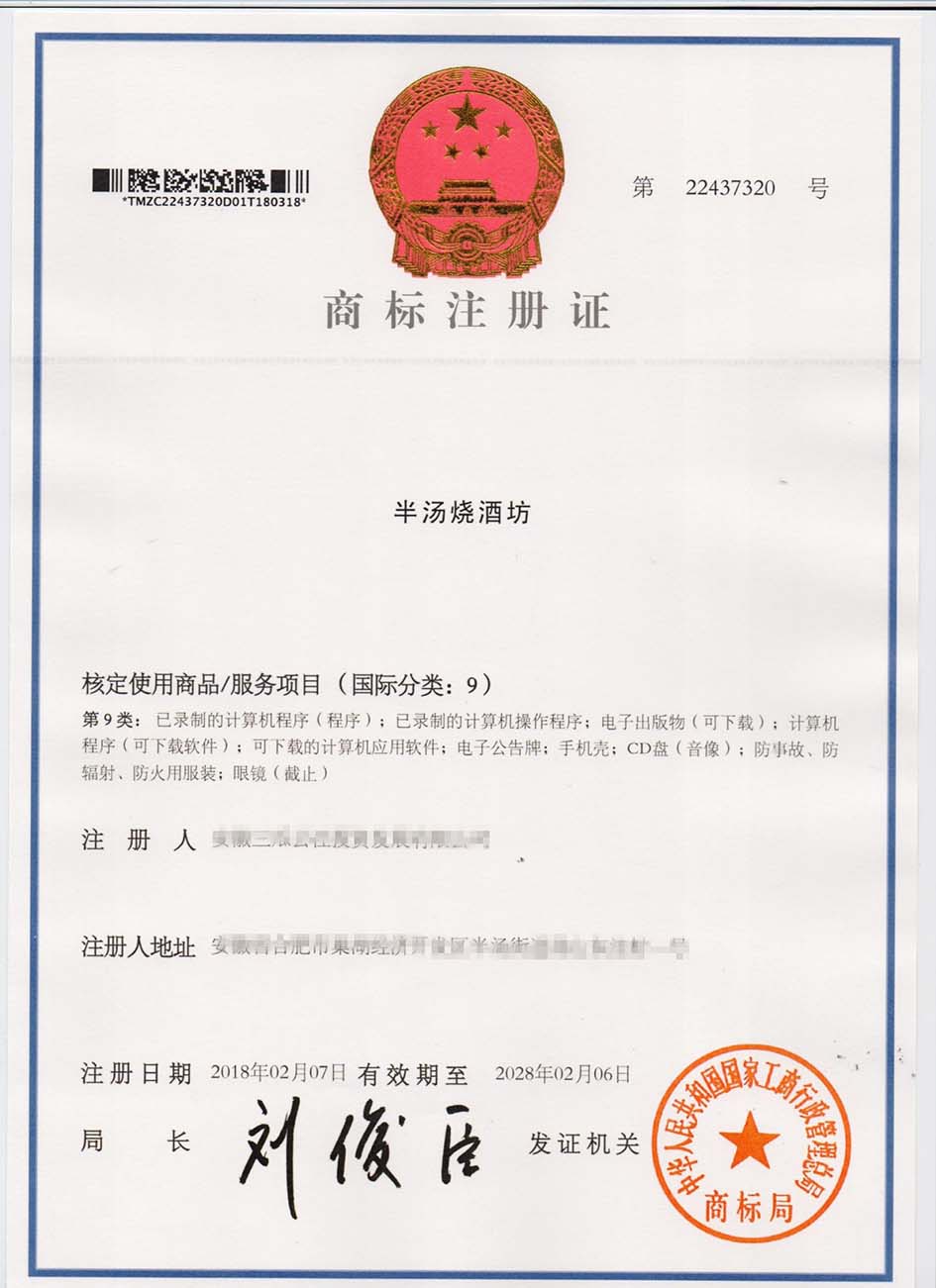 第9类“半汤烧酒坊”商标注册证