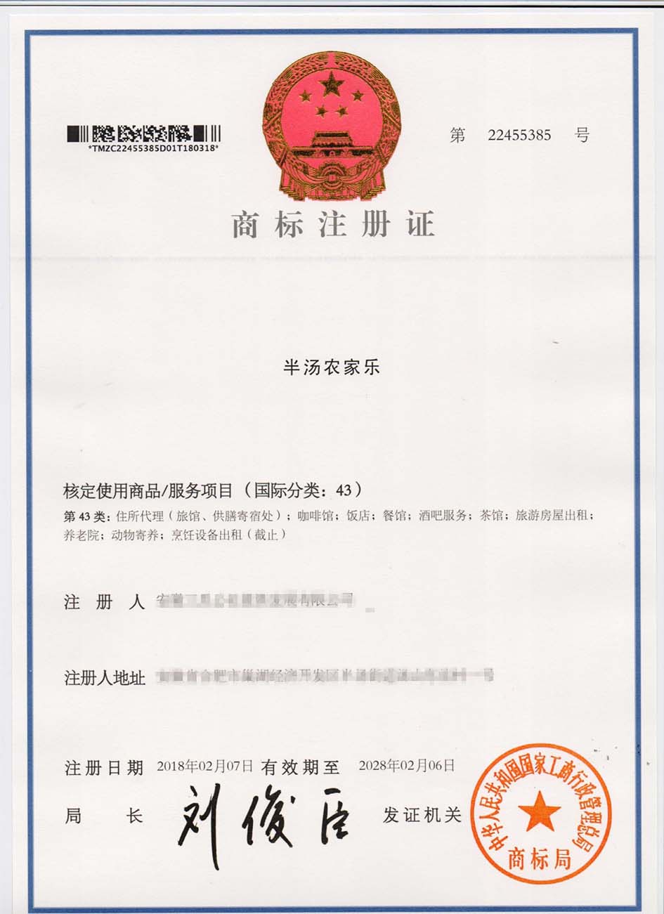 第43类“半汤农家乐”商标注册证
