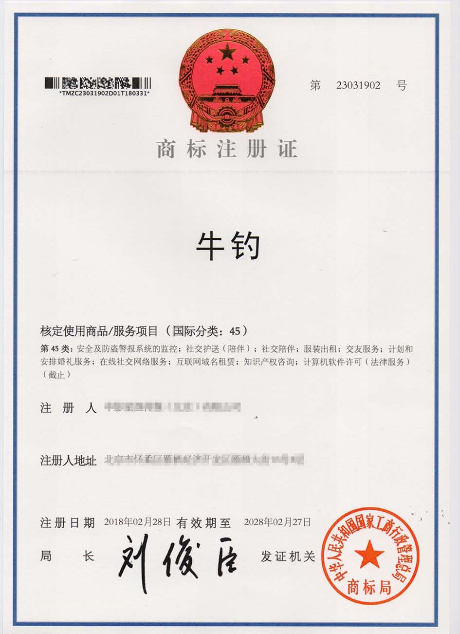 第45类“牛钓”商标注册证