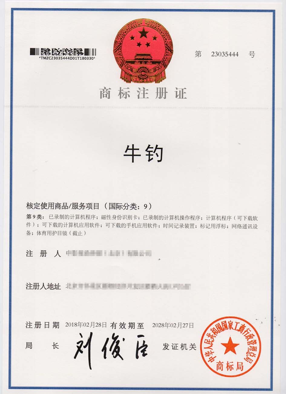 第9类“牛钓”商标注册证
