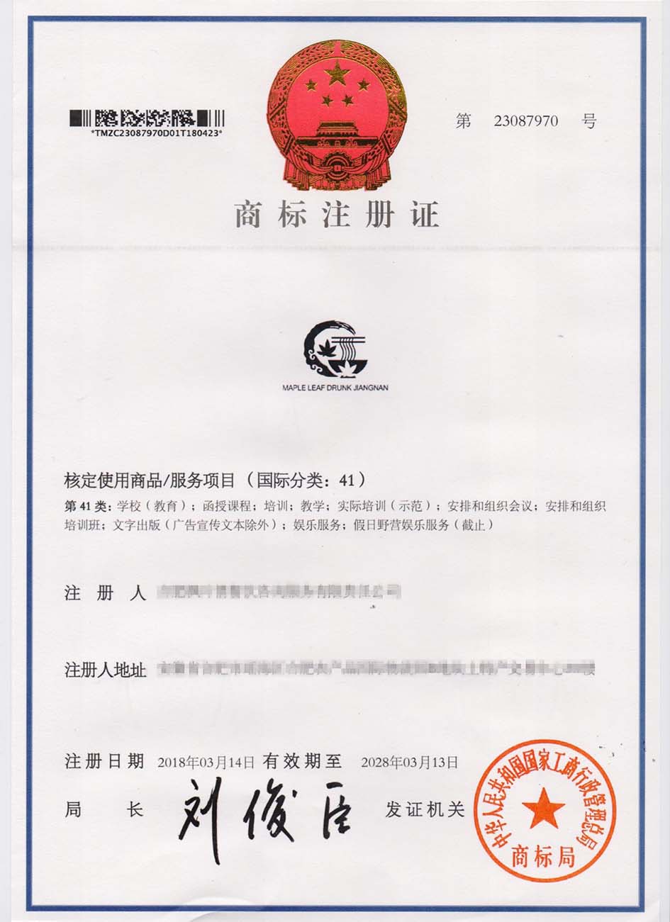 第41类“MAPLE LEAF DRUNK JIANGNAN”商标注册证