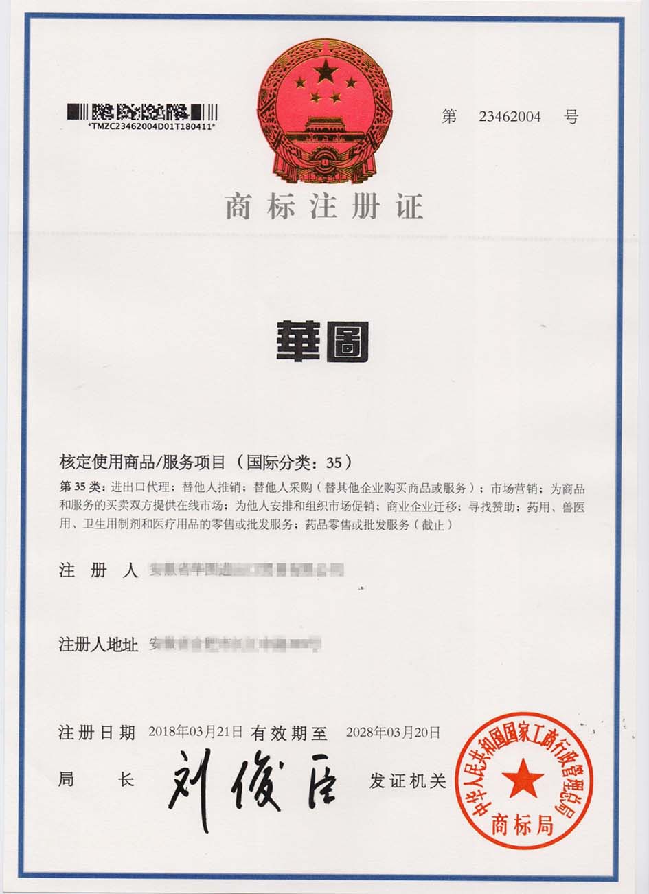 第35类“华图”商标注册证
