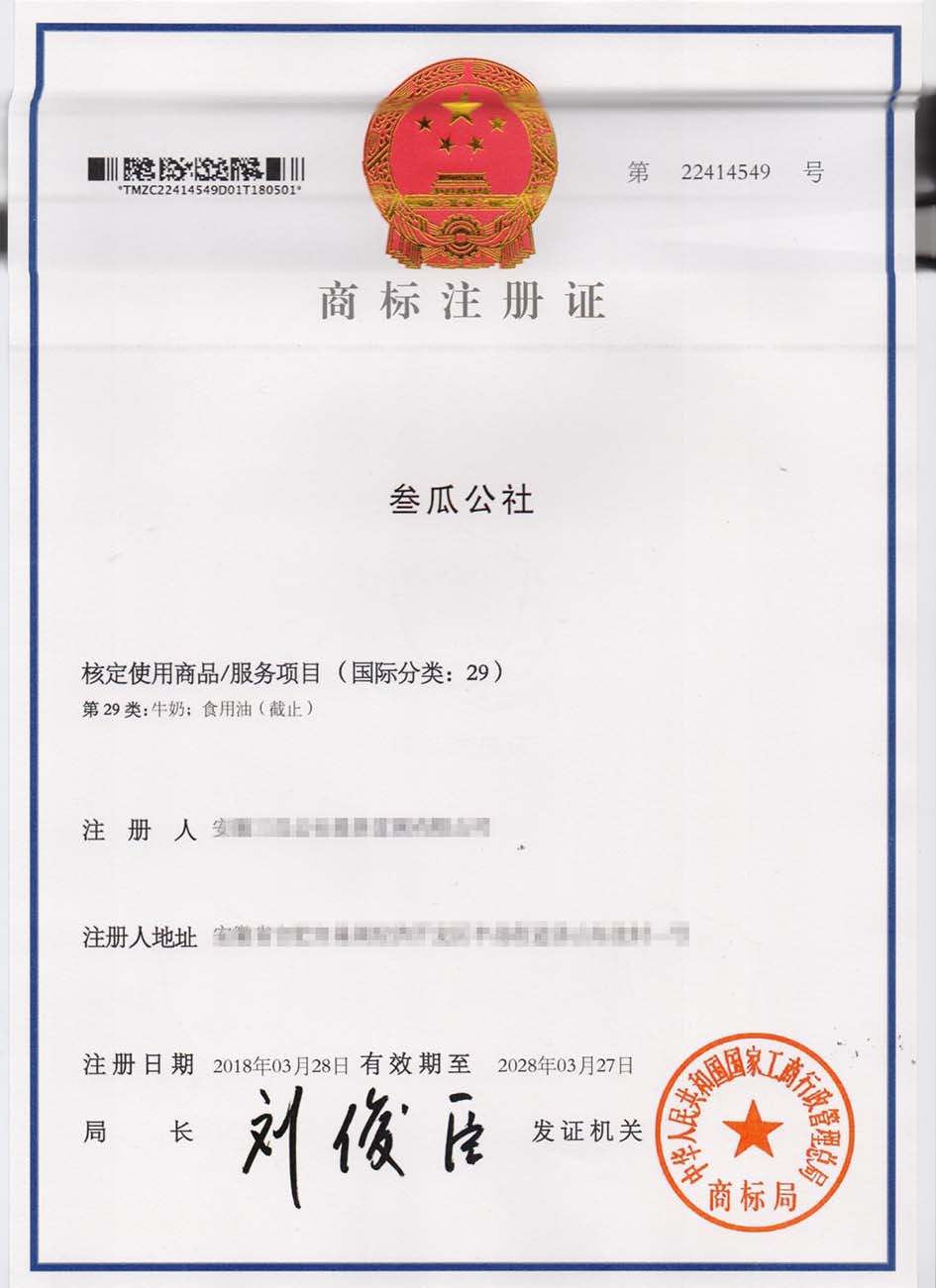 第29类“叁瓜公社”商标注册证