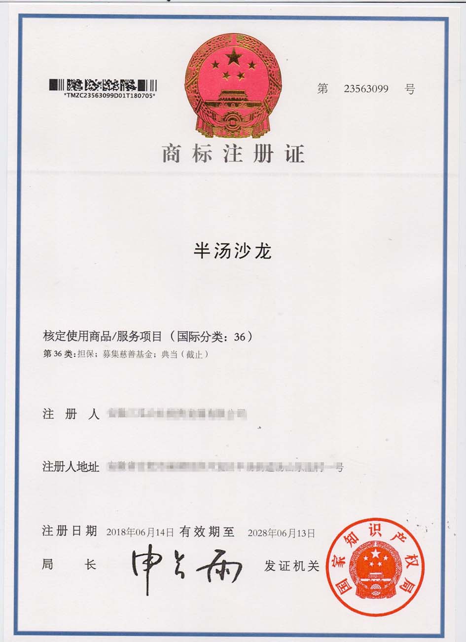 第36类“半汤沙龙”商标注册证