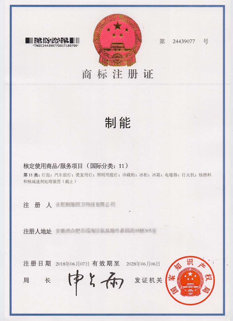 第11类“制能”商标注册证