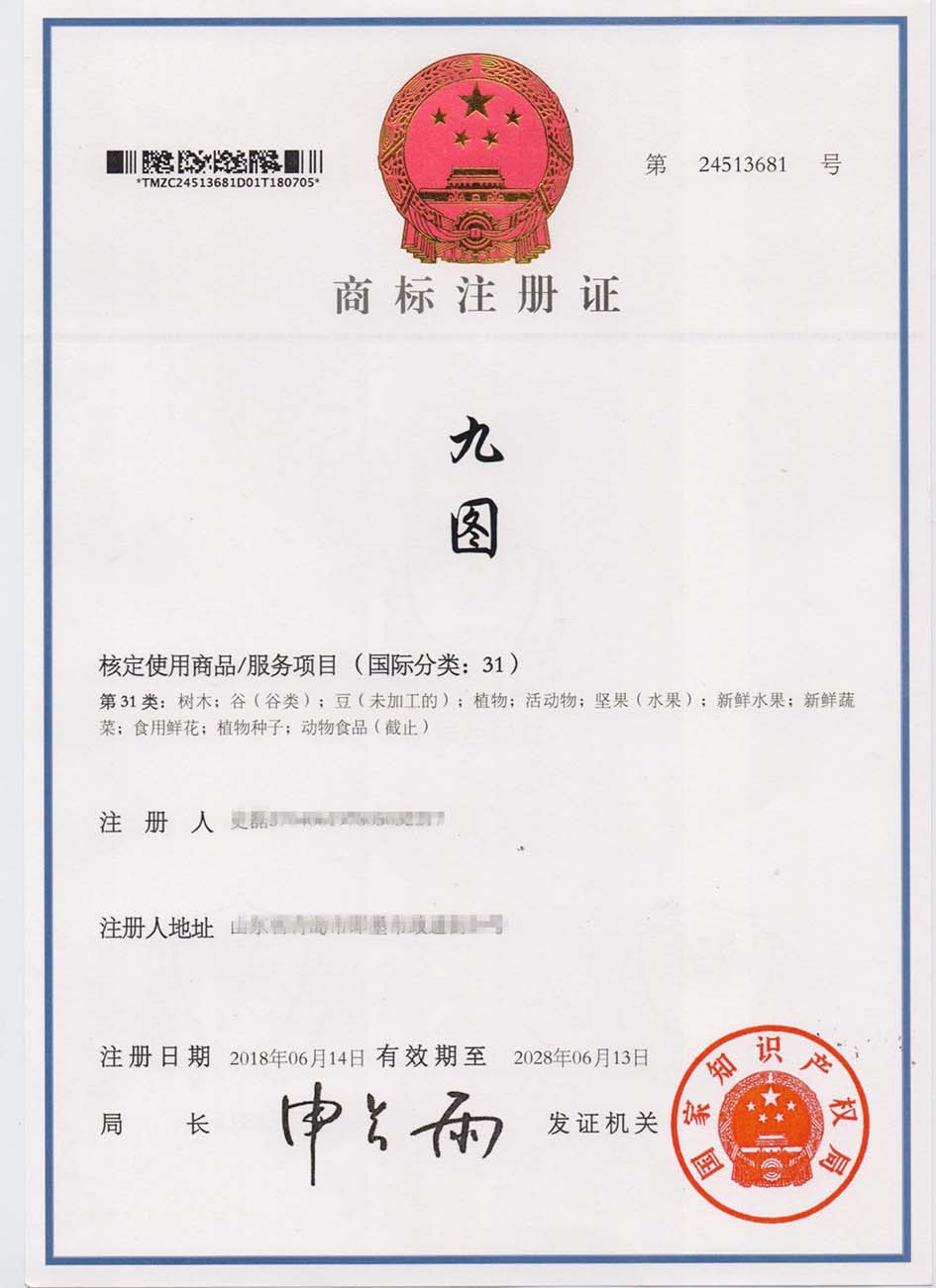 第31类“九图”商标注册证