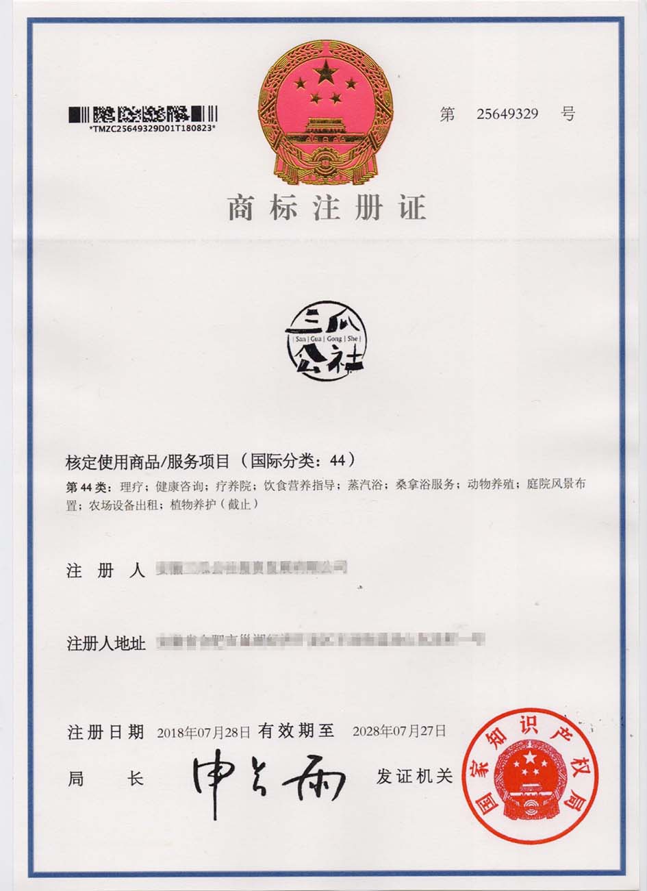 第44类“三瓜公社 SAN GUA GONG SHE”商标注册证