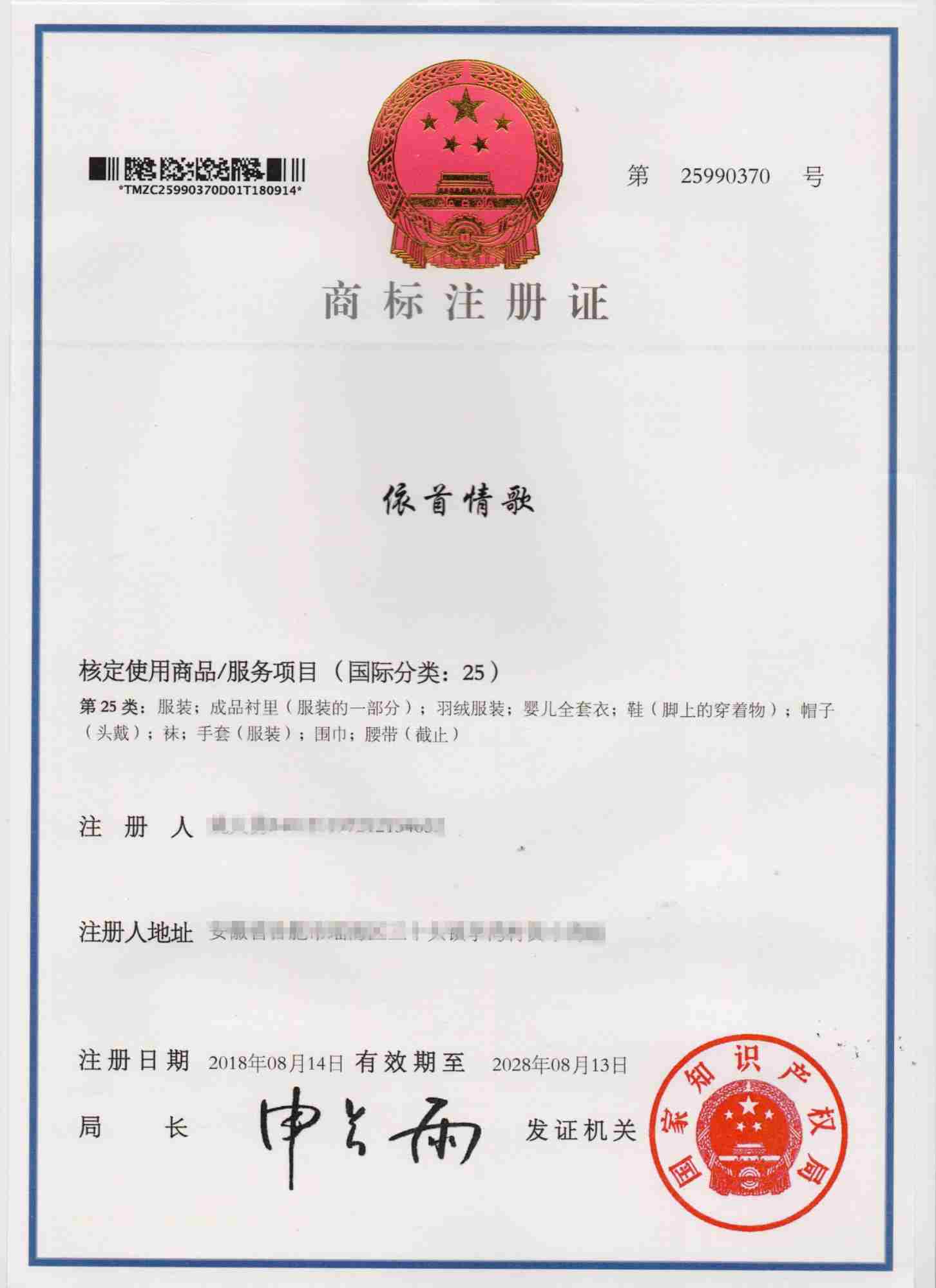 第25类“依首情歌”商标注册证