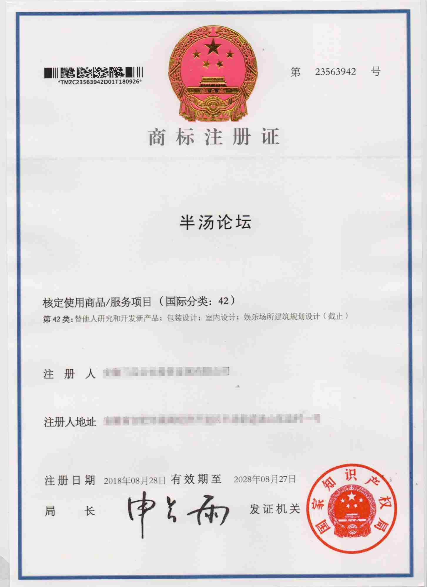 第42类“半汤论坛”商标注册证