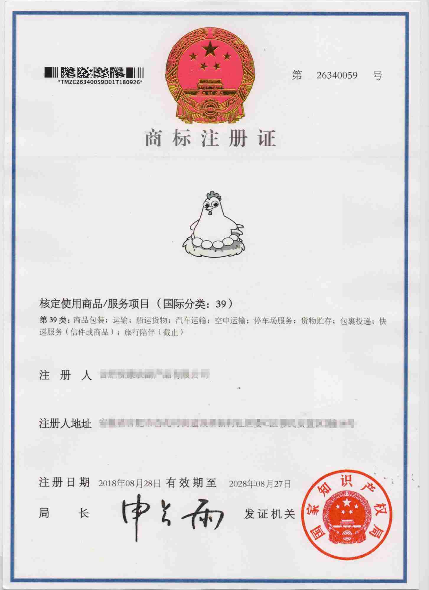 第39类“鸡图形”商标注册证
