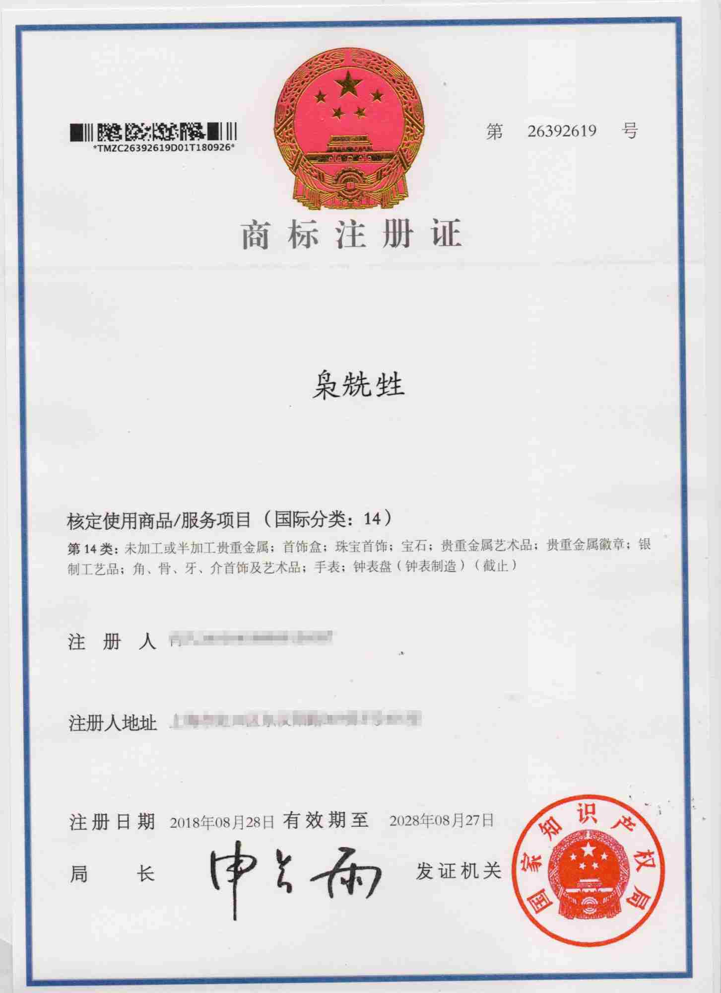第14类“枭兟甡”商标注册证