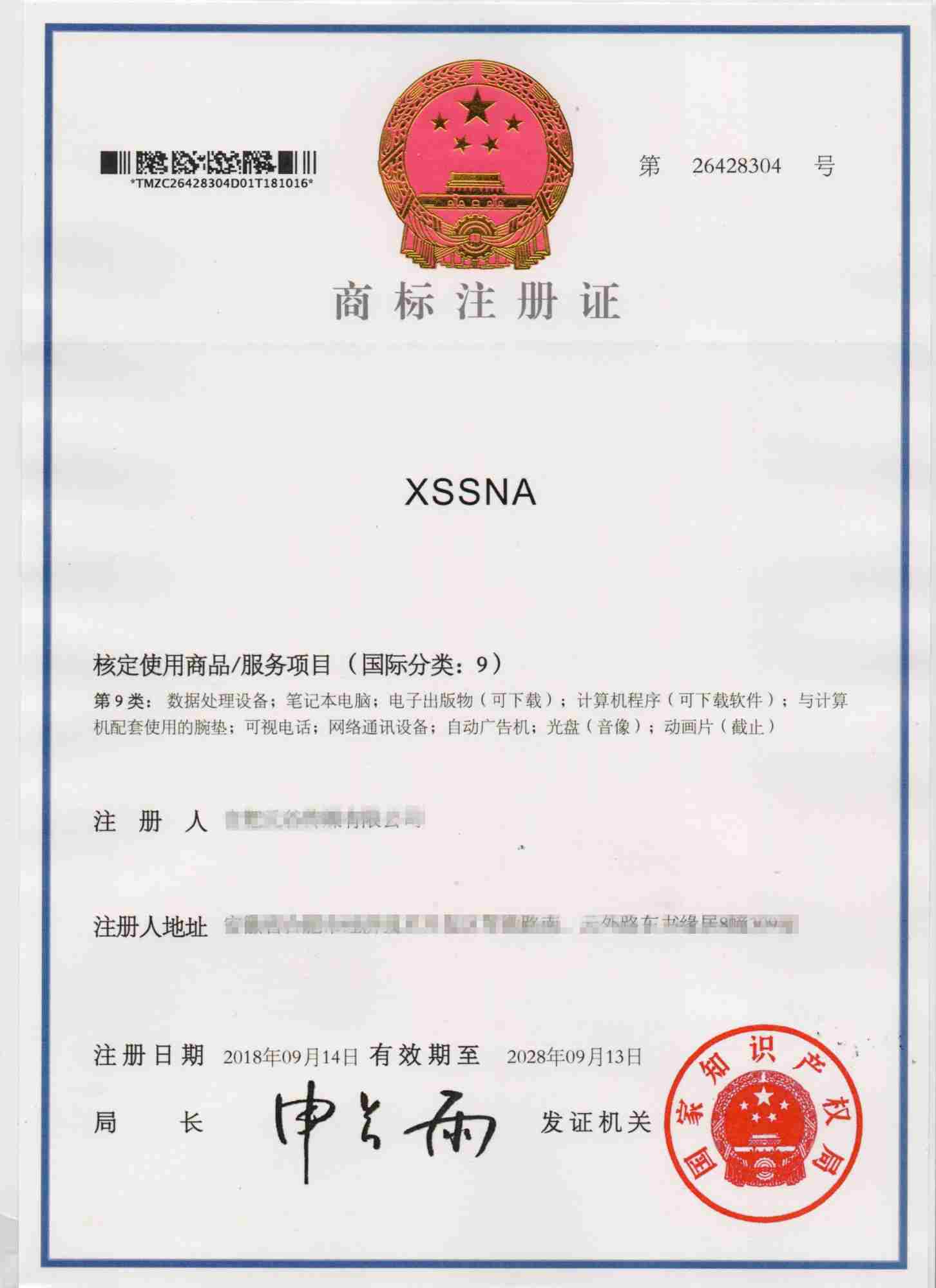 第9类“XSSNA”商标注册证