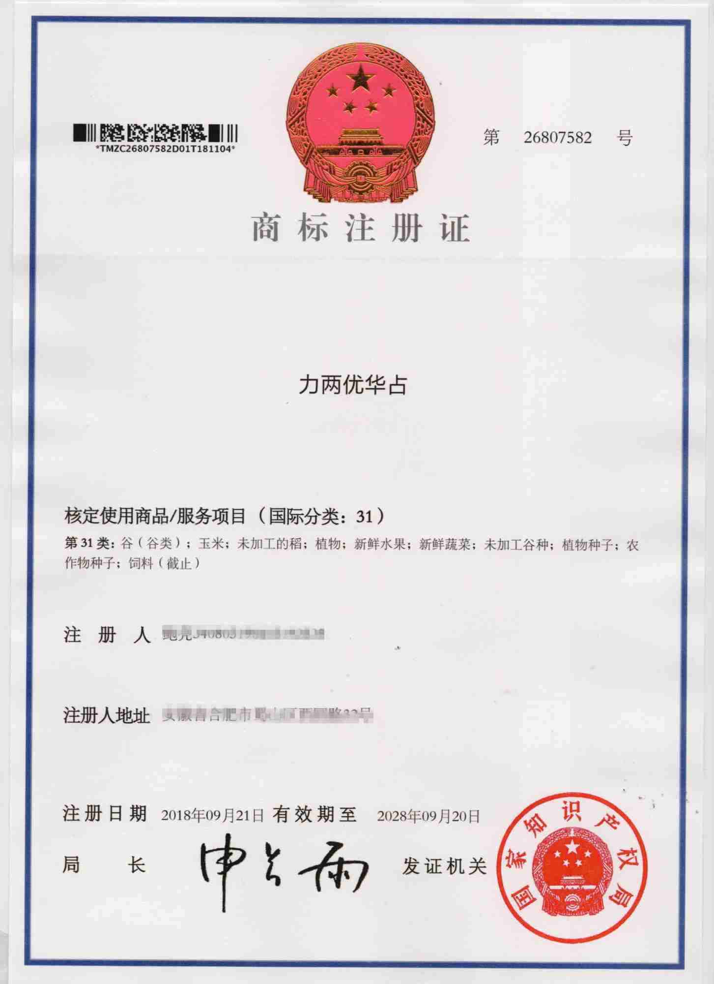 第31类“力两优华占”商标注册证