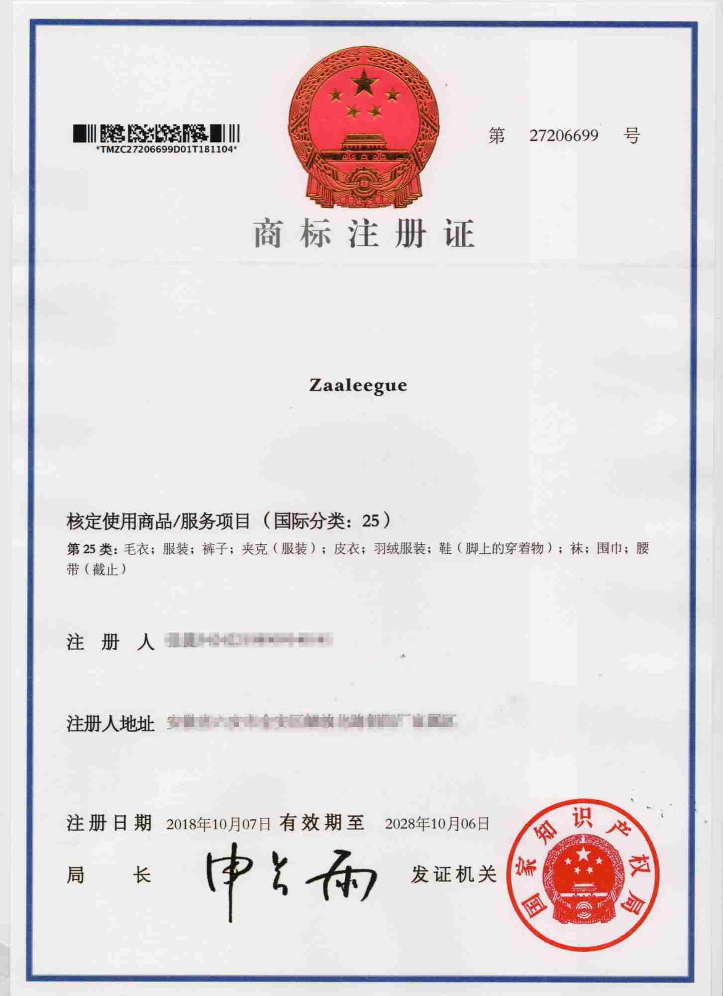 第25类“Zaaleegue”商标注册证