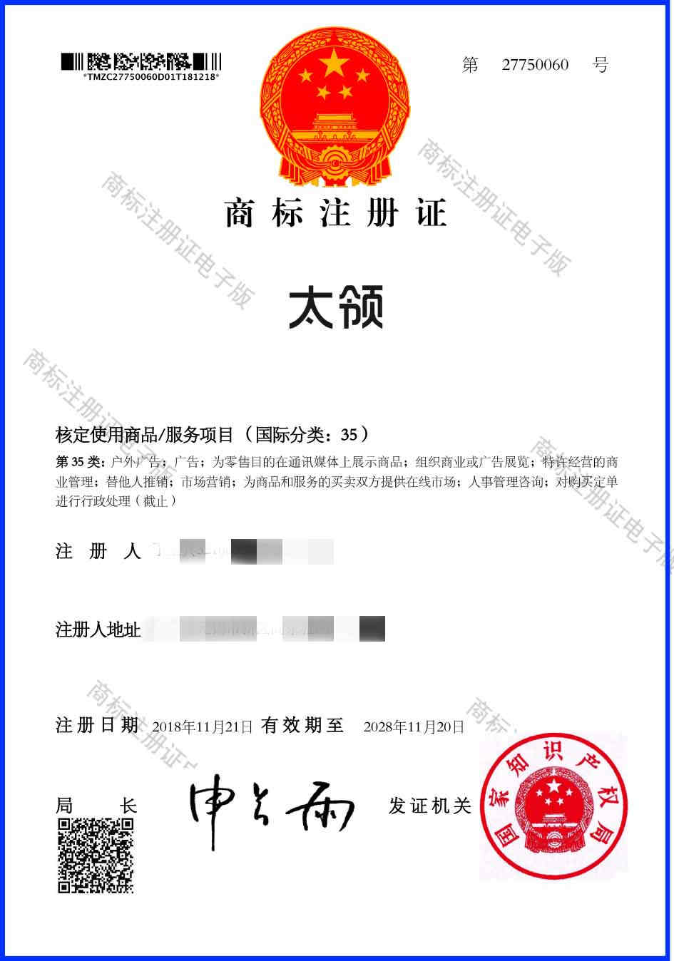 第35类“太领”商标注册证