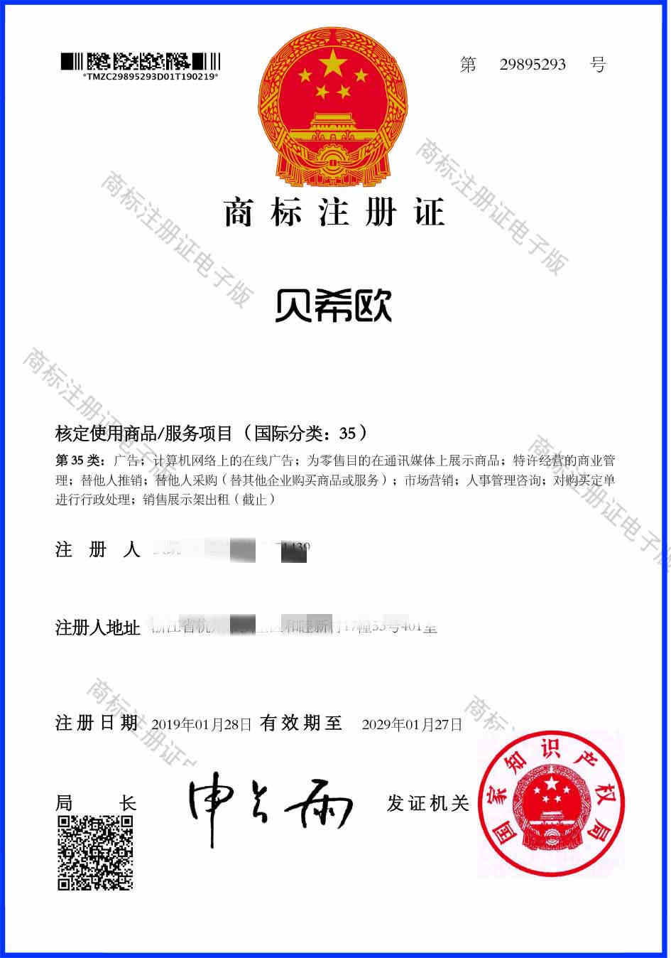 第35类“贝希欧”商标注册证