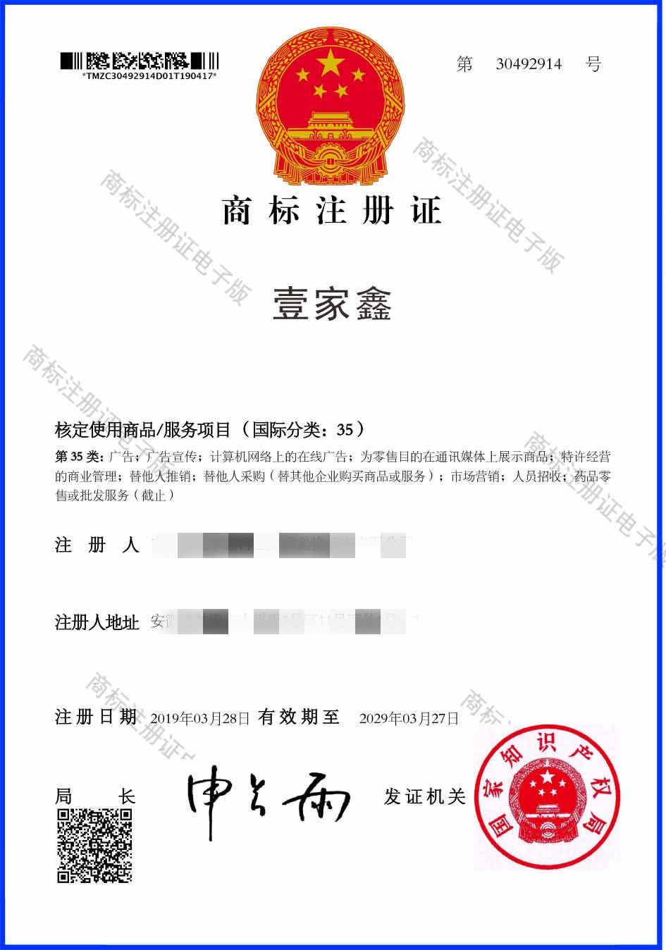第35类“壹家鑫”商标注册
