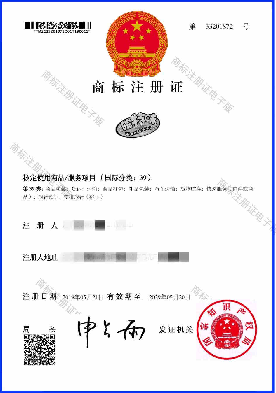 第39类“皖特味”商标注册证