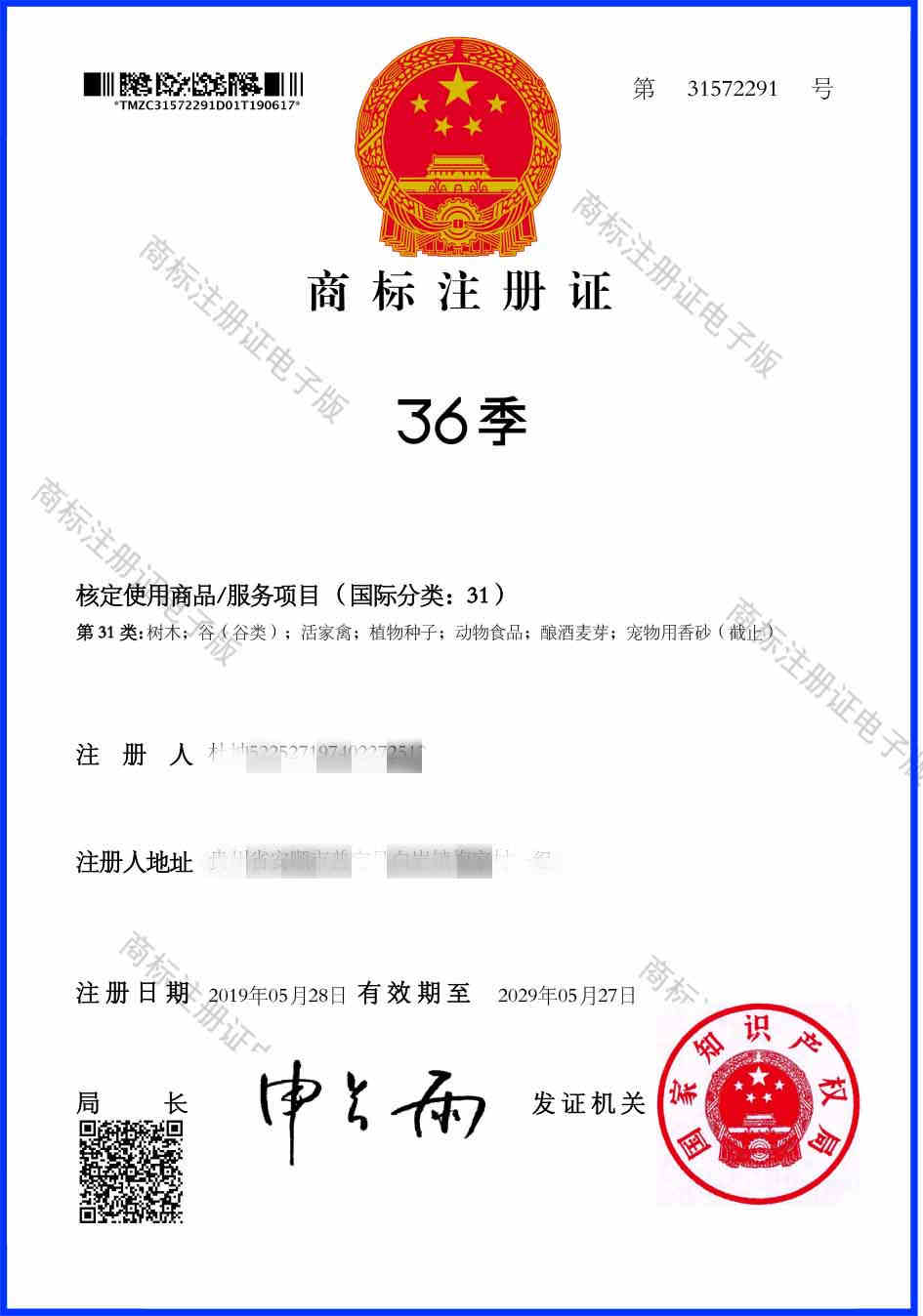 第31类“36季”商标注册证