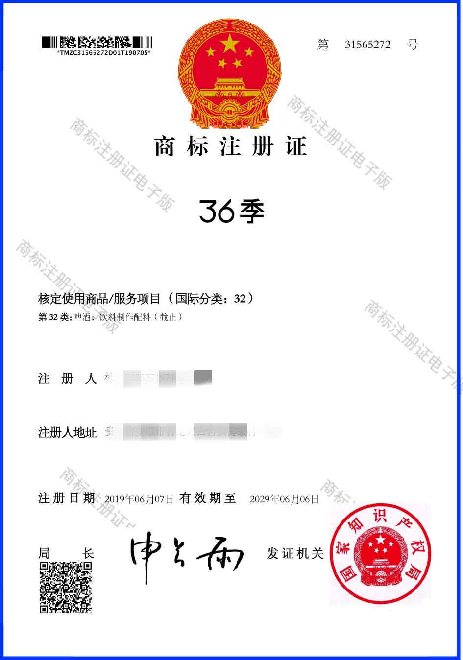 第32类“36季”商标注册证