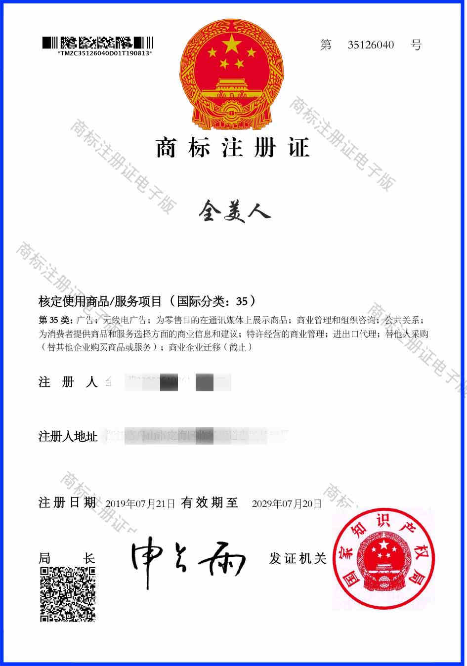 第35类“全美人”商标注册证