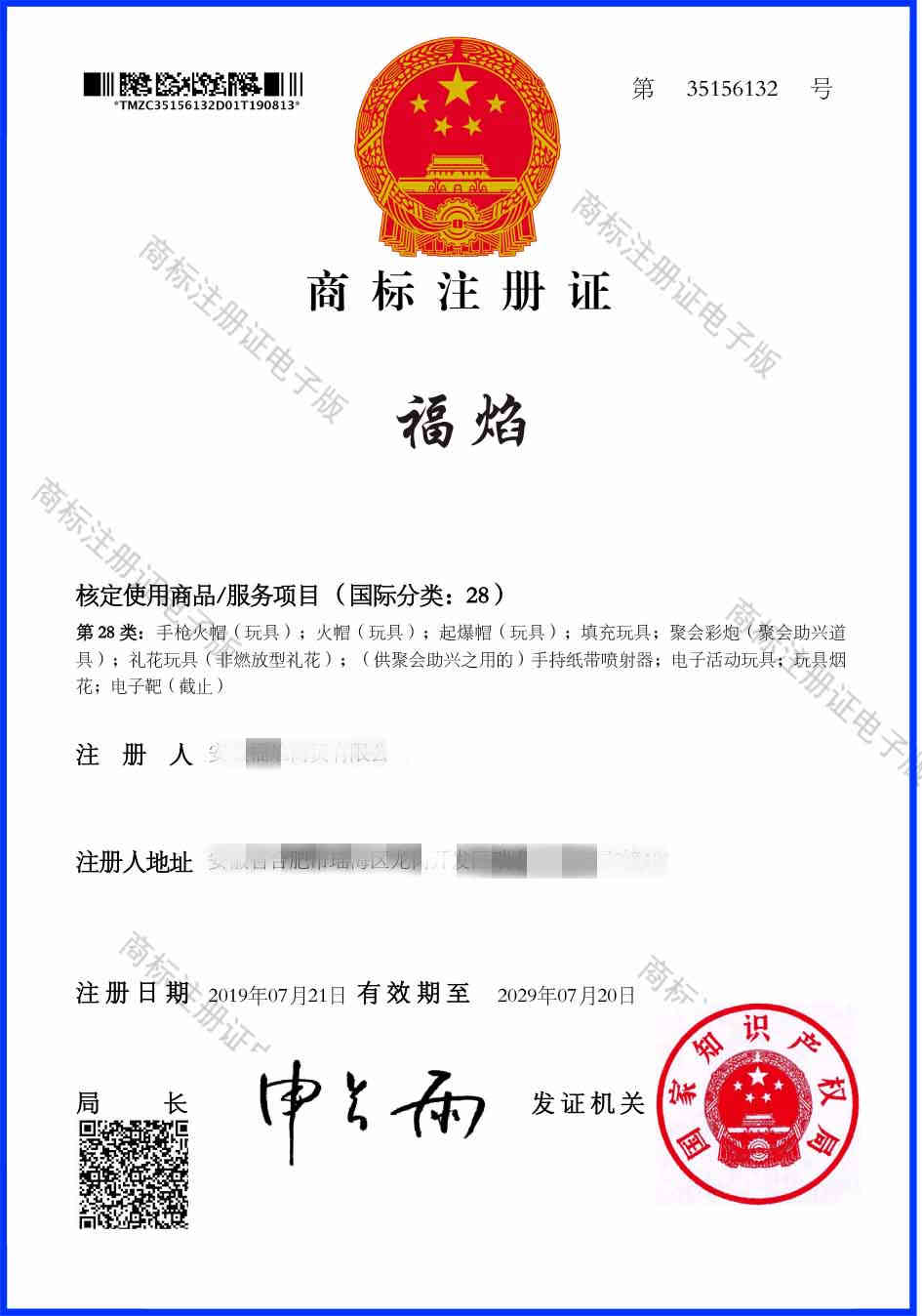 第28类“福焰”商标注册证