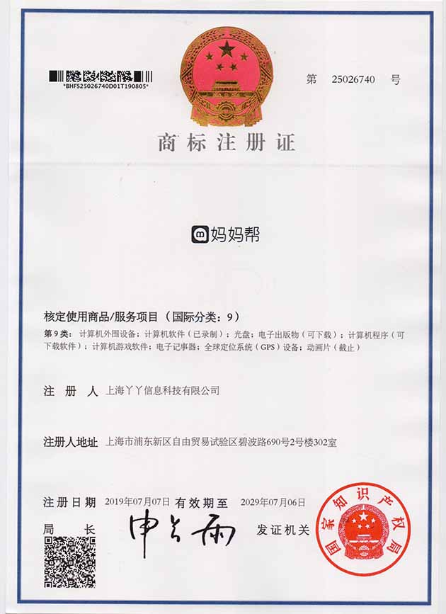 第9类“妈妈帮”商标注册证