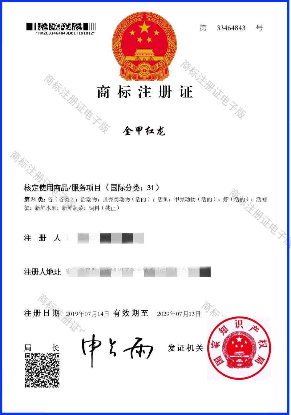 第31类“金甲红龙”商标注册证