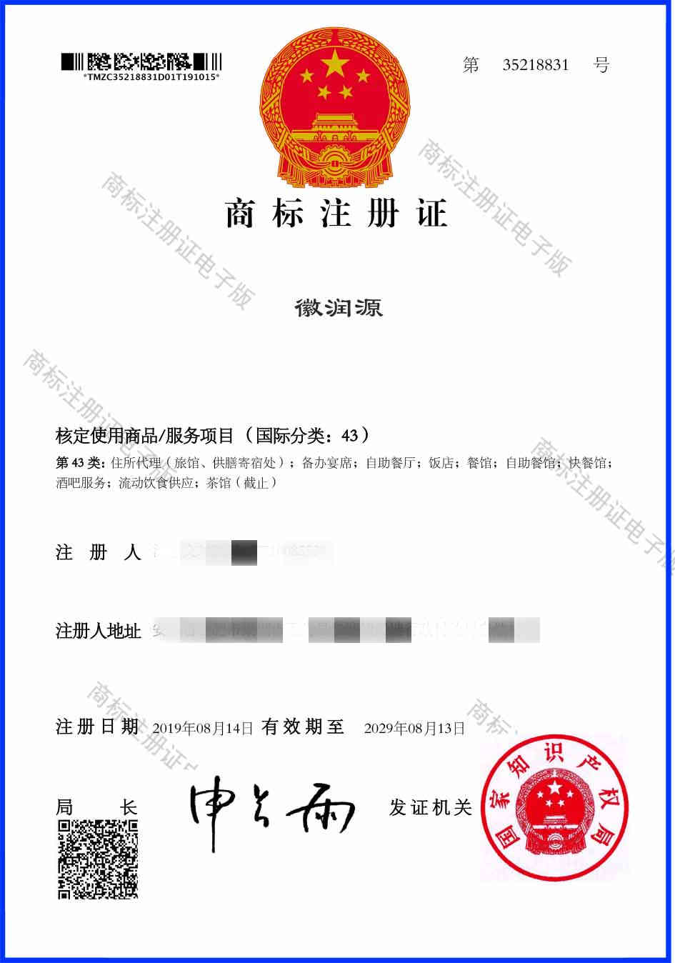第43类“徽润源”商标注册证