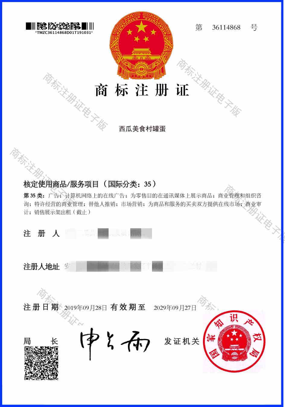 第35类“西瓜美食村罐蛋”商标注册证
