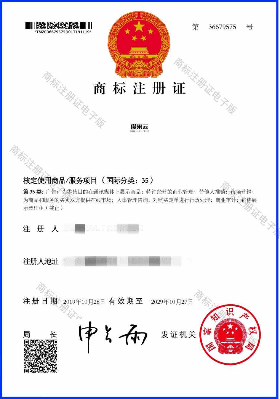 第35类“俊采云”商标注册证