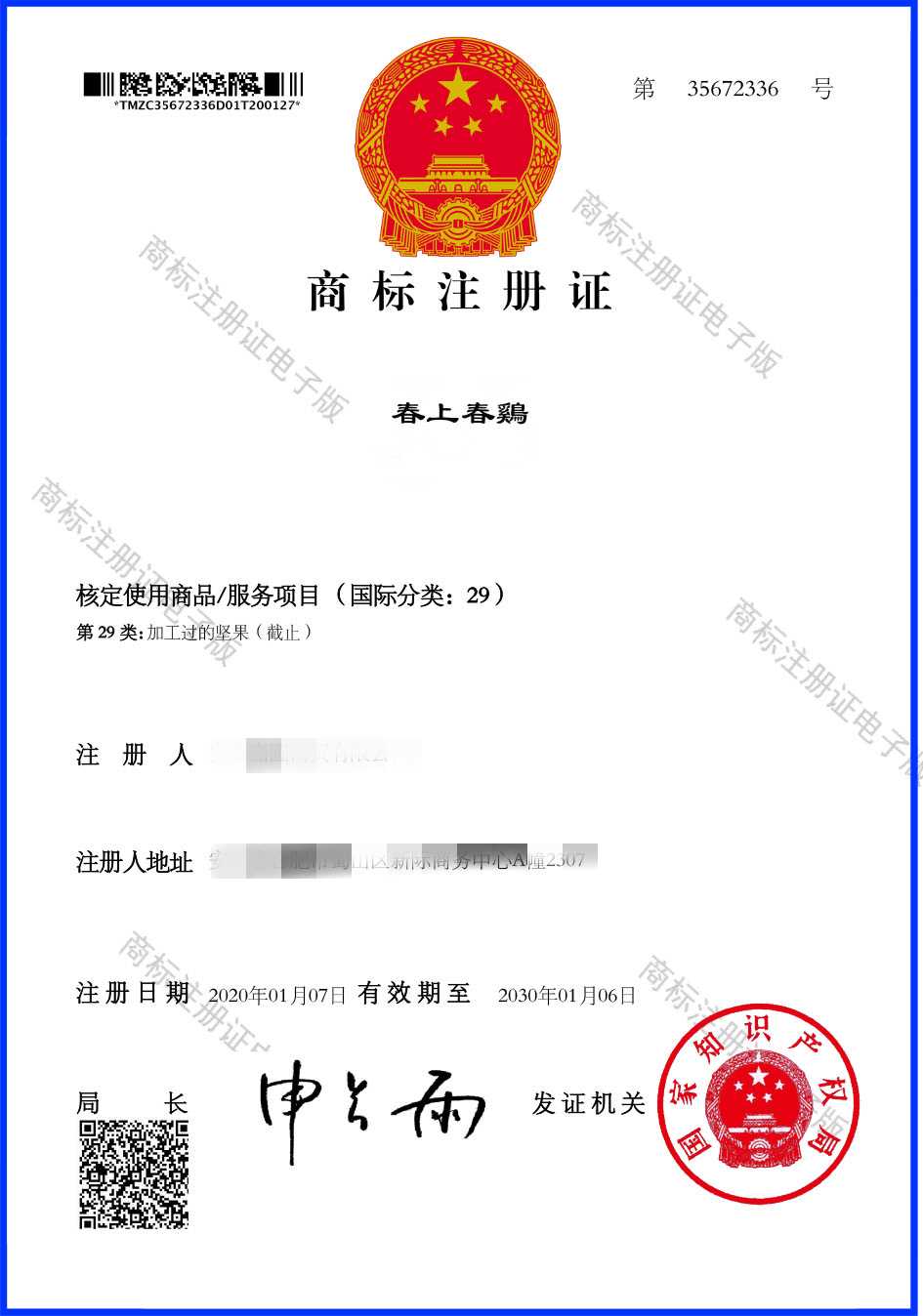 第29类“咿呀可”商标注册证