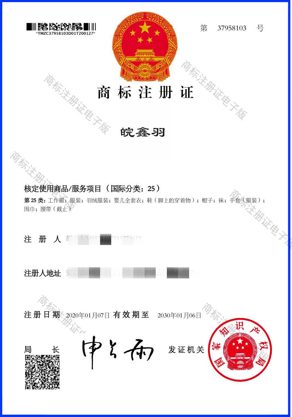 第25类“皖鑫羽”商标注册证