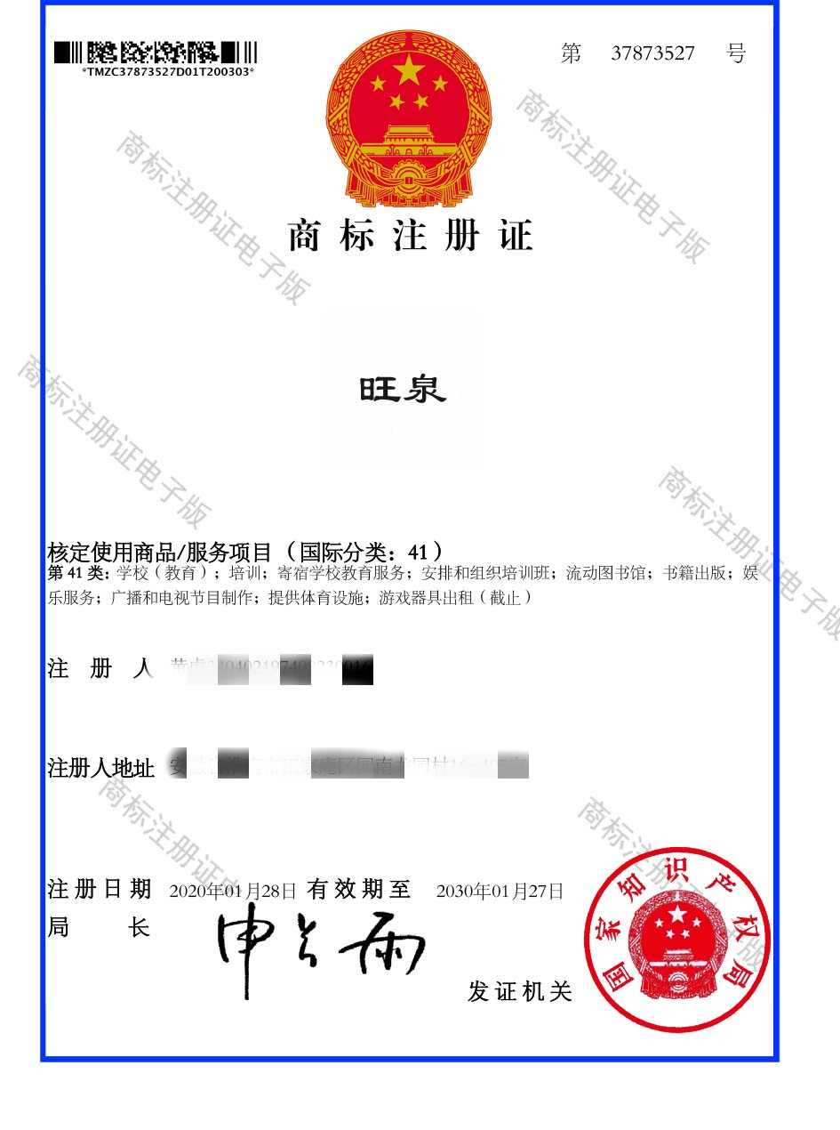 第41类“旺泉”商标注册证