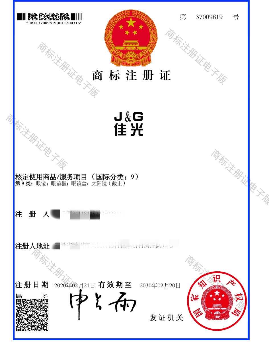 第9类“佳光”商标注册证