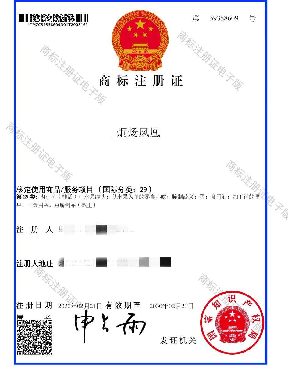 第29类“烔炀凤凰”商标注册证