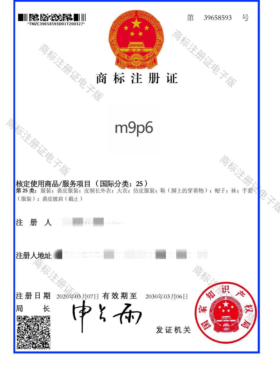 第25类“M9P6”商标注册证