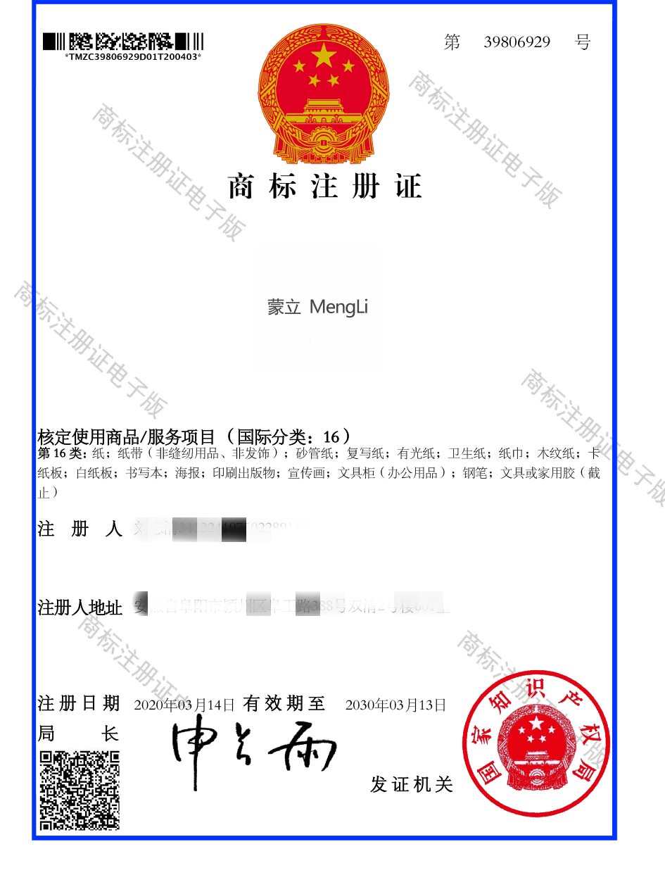 第16类“蒙立”商标注册证