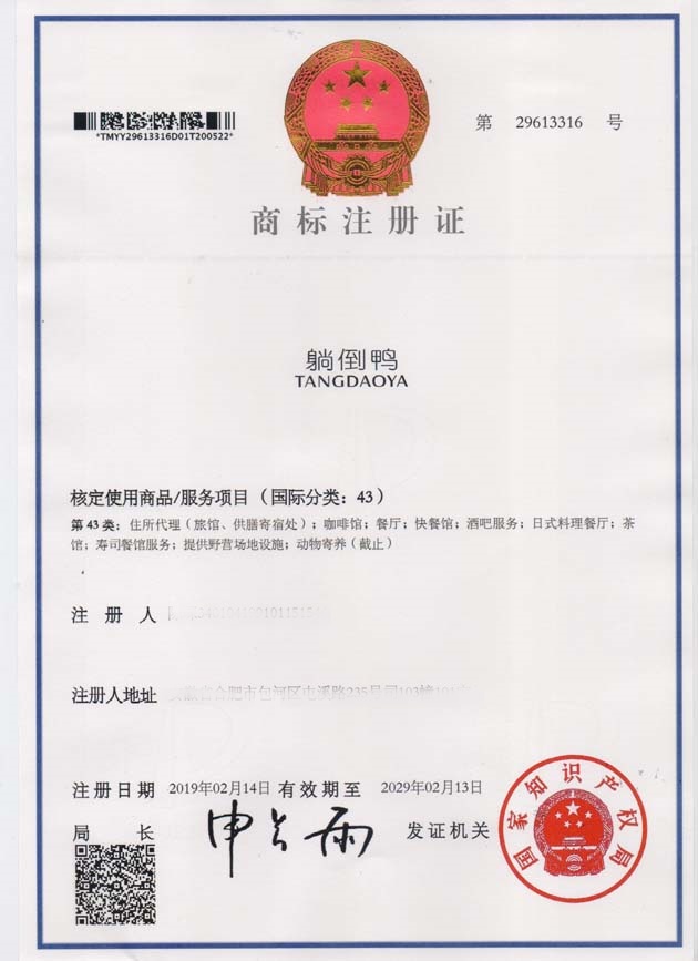 第43类“躺当鸭”商标注册证