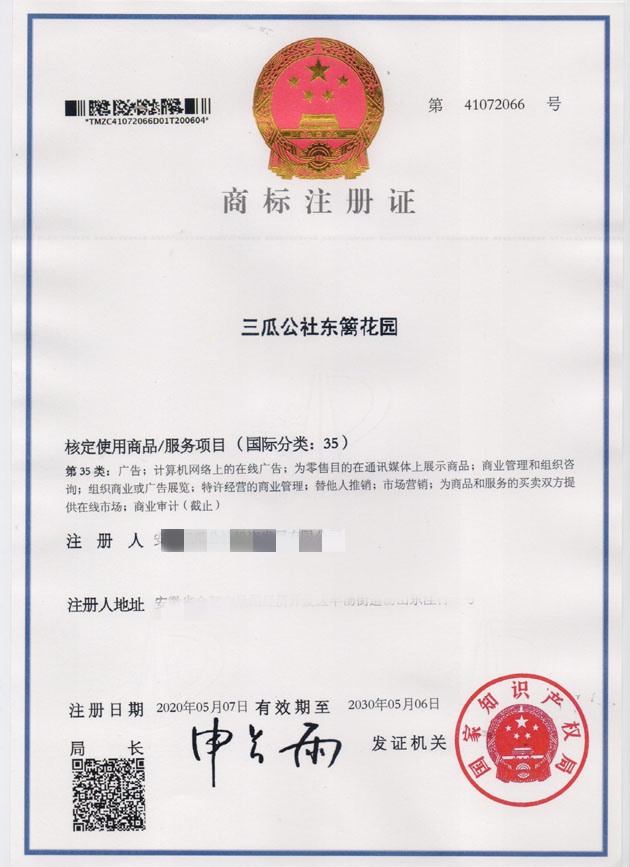 第35类“三瓜公社东篱花园”商标注册证