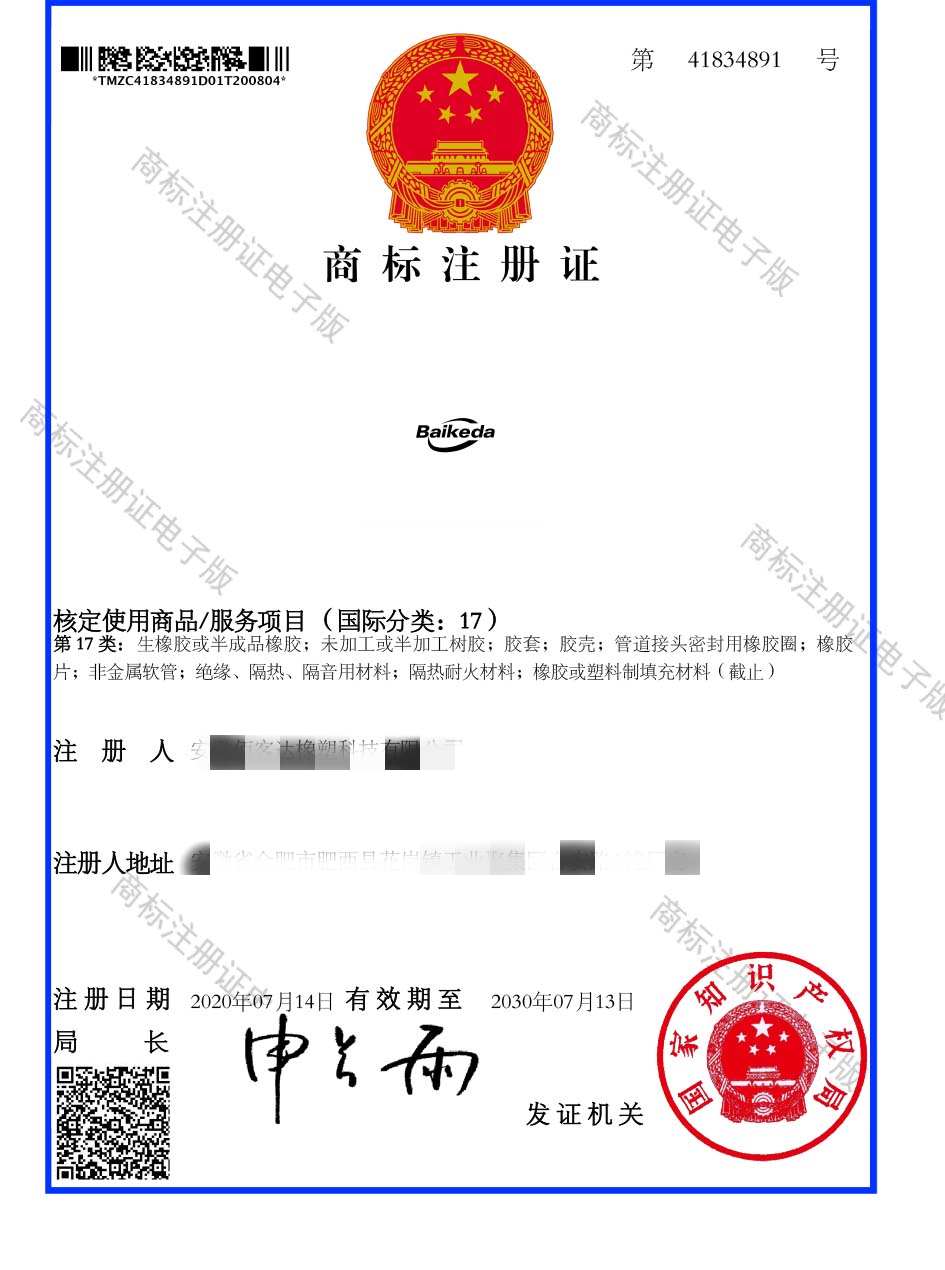 第17类“BAIKEDA”商标注册证