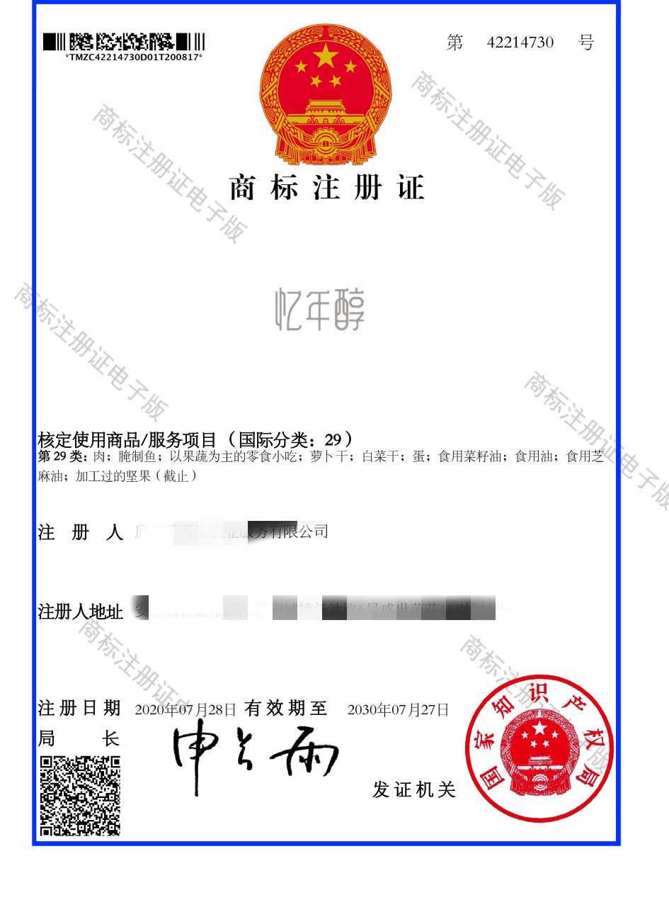 第29类“忆年醇”商标注册证