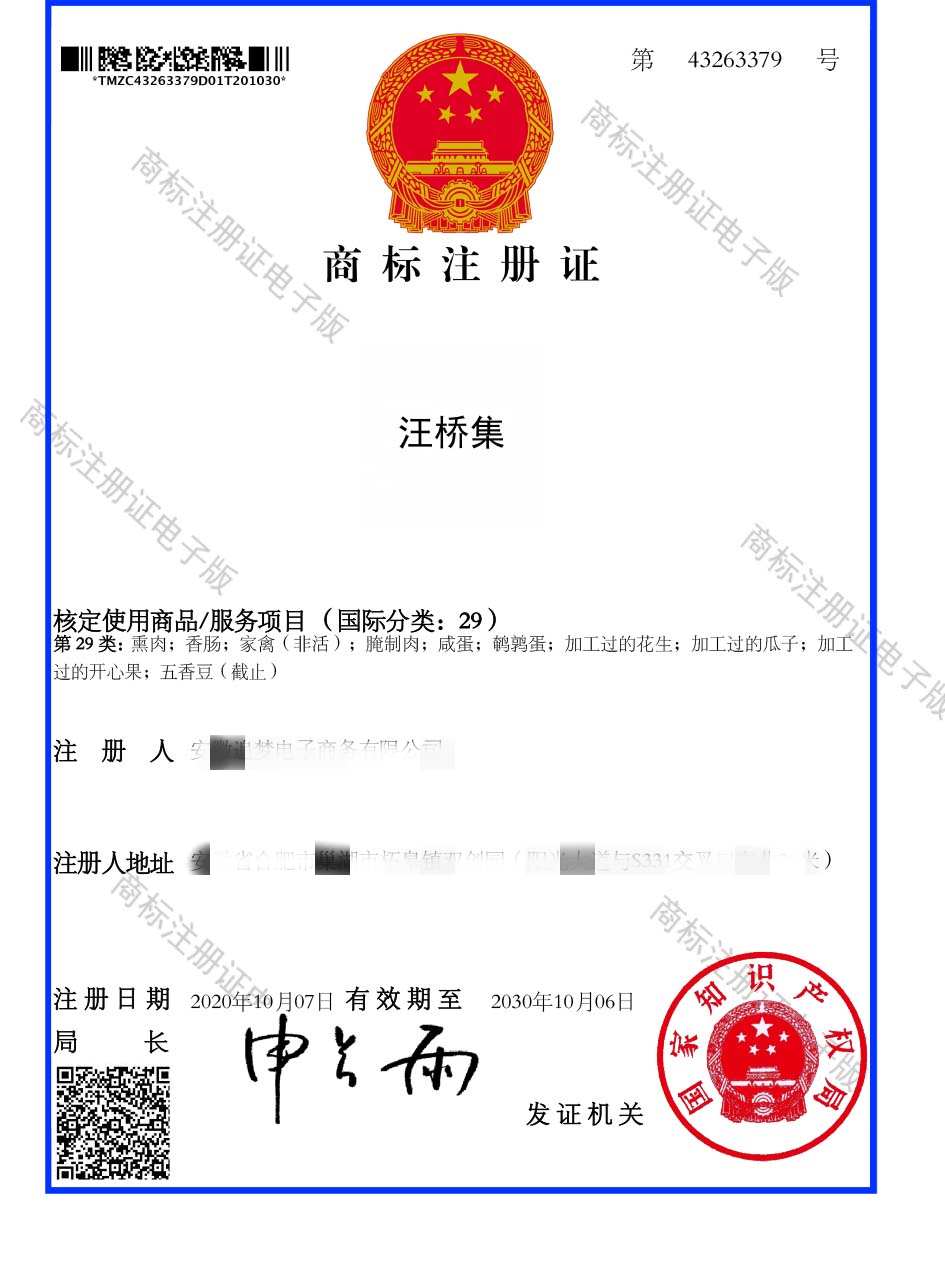 第29类“汪桥集”商标注册证