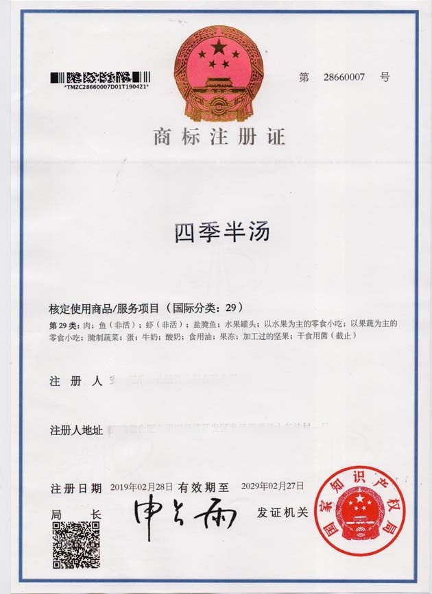 第29类“四季半汤”商标注册证