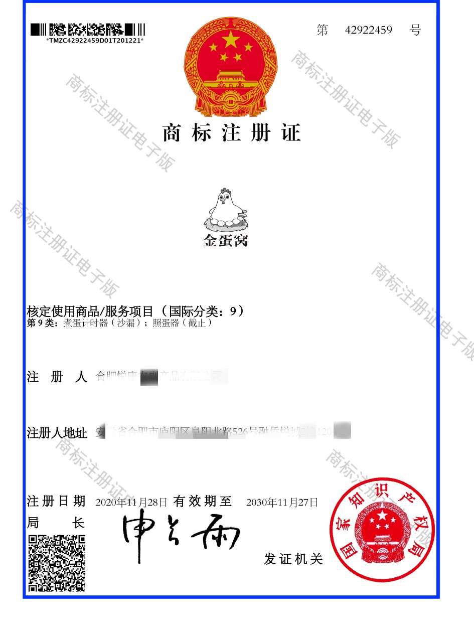 第9类“金蛋窝”商标注册证