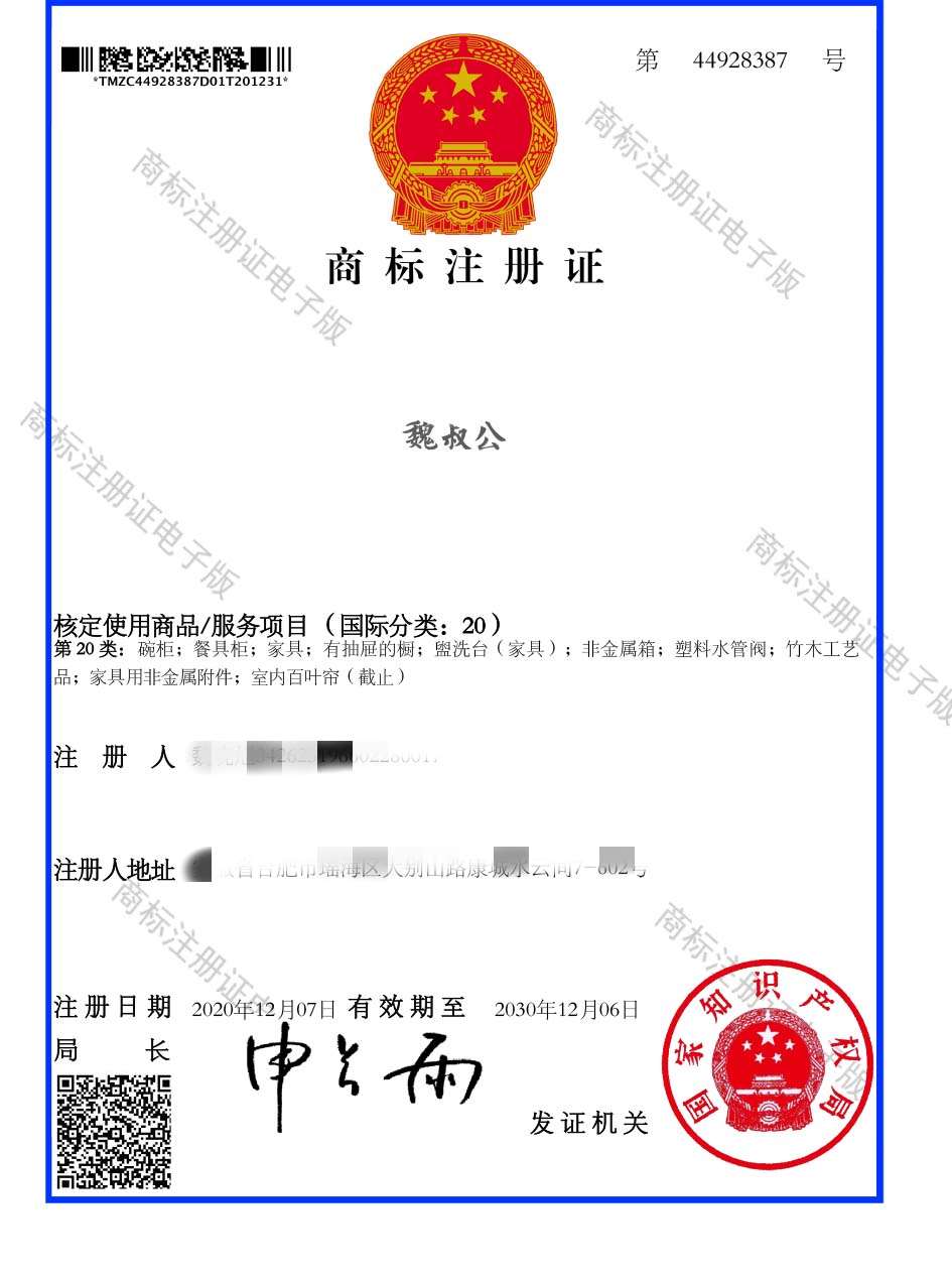 第20类“魏叔公”商标注册证