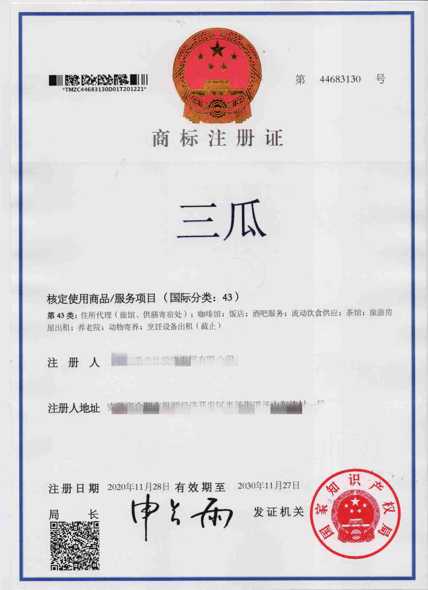 第43类“三瓜”商标注册证